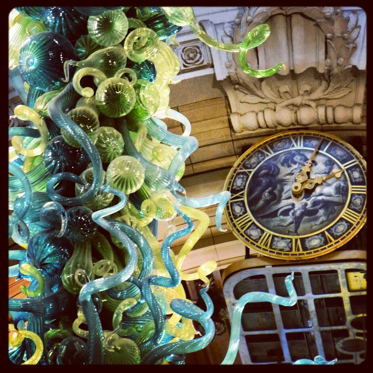 IMG_20130309_180827 Published March 10, 2013 at 1296 × 1296 in Photostream: London UK Holiday ← Previous Next → Glass sculpture and clock in the atrium of the Victoria and Albert Museum