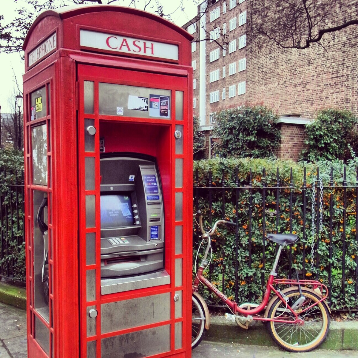 IMG_20130309_183223 Published March 10, 2013 at 1296 × 1296 in Photostream: London UK Holiday ← Previous Next → Cash machine and bicycle in Notting Hill
