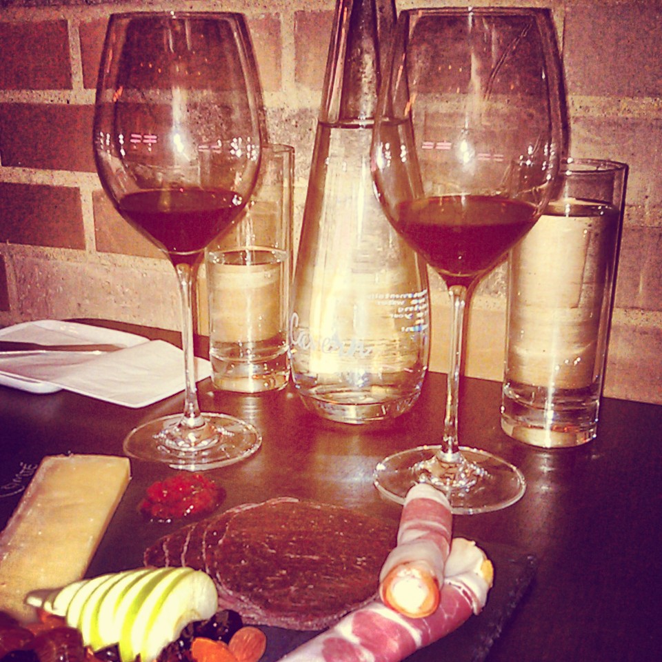 IMG_20140507_201021 Published May 7, 2014 at 960 × 960 in Edmonton Restaurant Review: The Cavern ← Previous Next → Glasses of Italian red wine and our cheese and charcuterie board on my second visit.