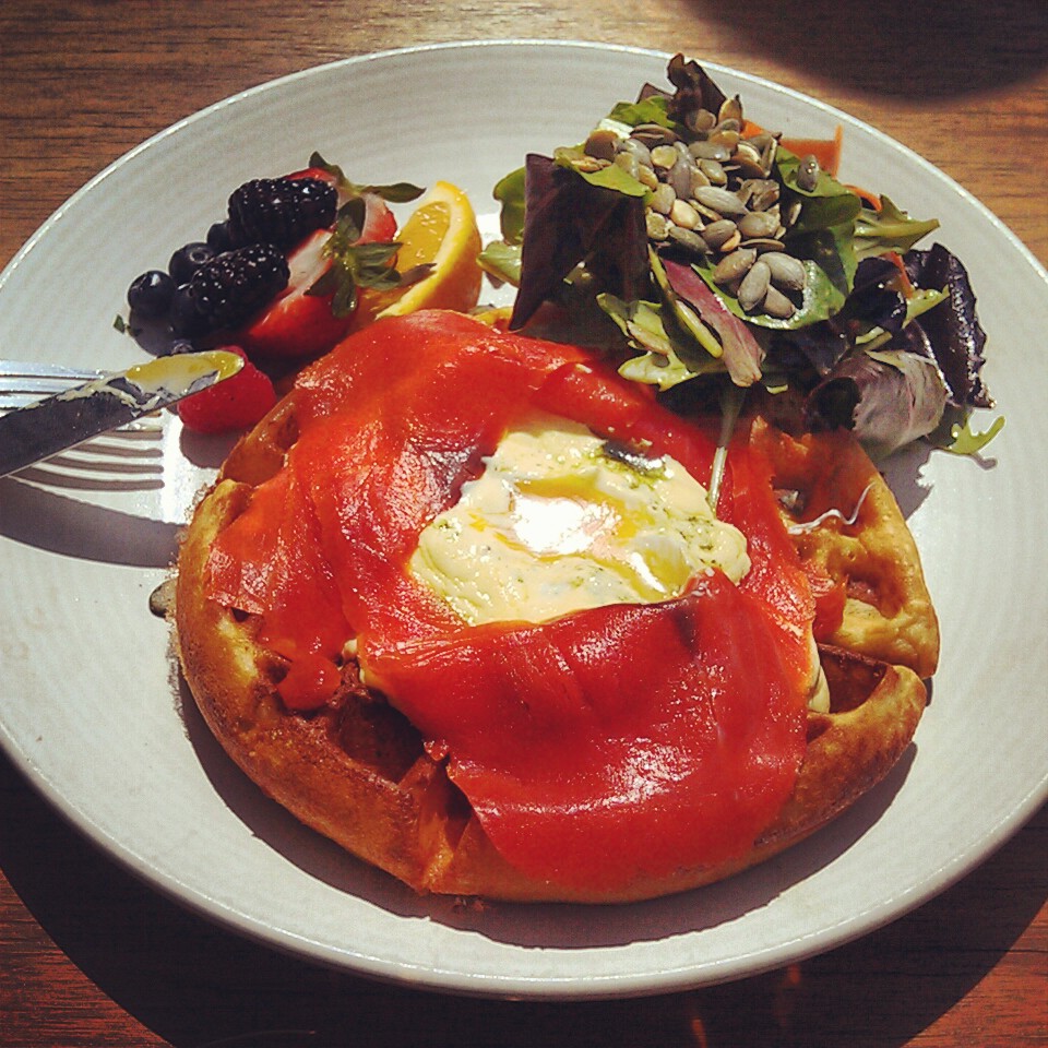 IMG_20140519_214943 Published August 24, 2014 at 960 × 960 in Edmonton Restaurant Review: Under the High Wheel ← Previous Next → My savoury Belgian waffle with smoked salmon.
