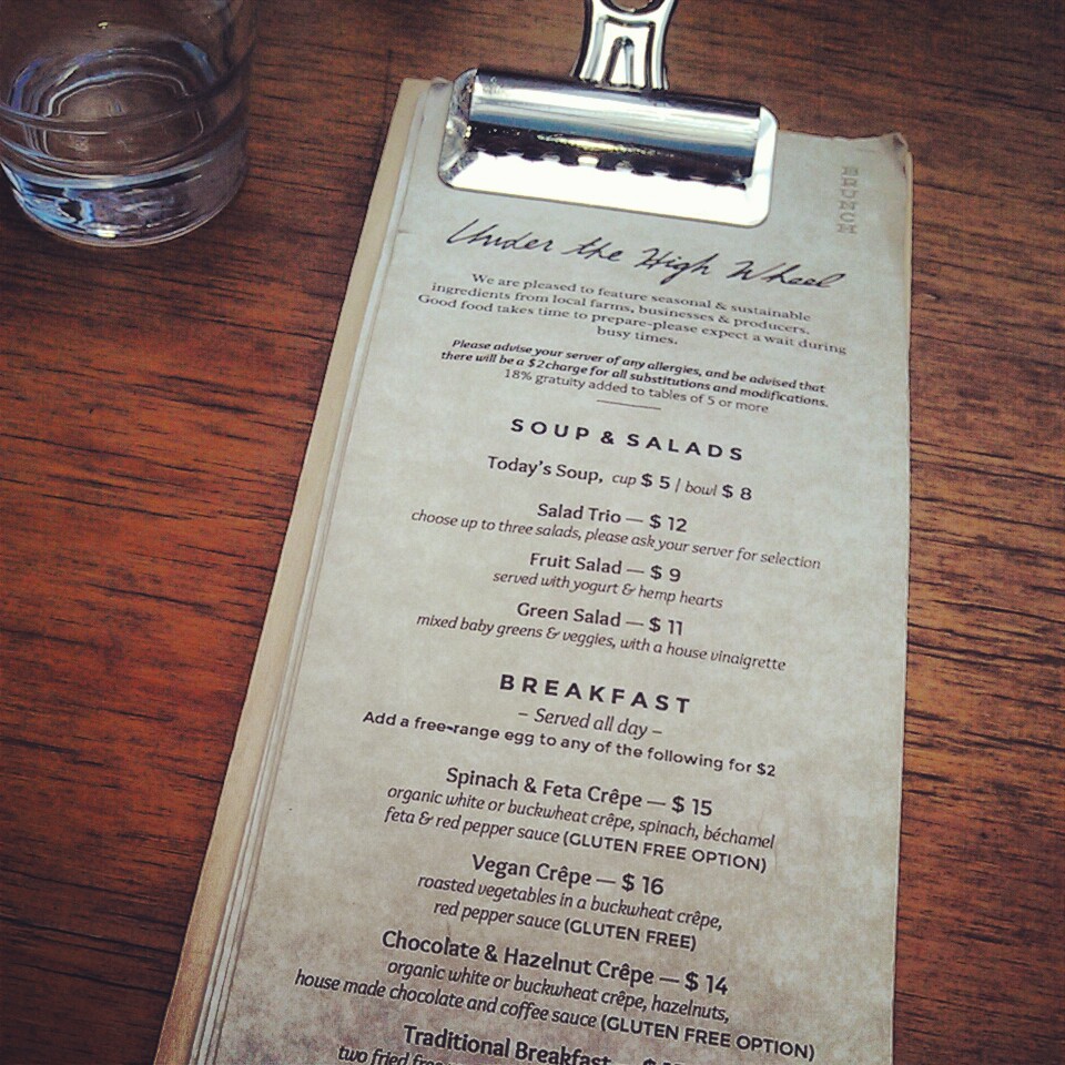 IMG_20140519_221100 Published August 24, 2014 at 960 × 960 in Edmonton Restaurant Review: Under the High Wheel ← Previous Next → The regular brunch/lunch menu.