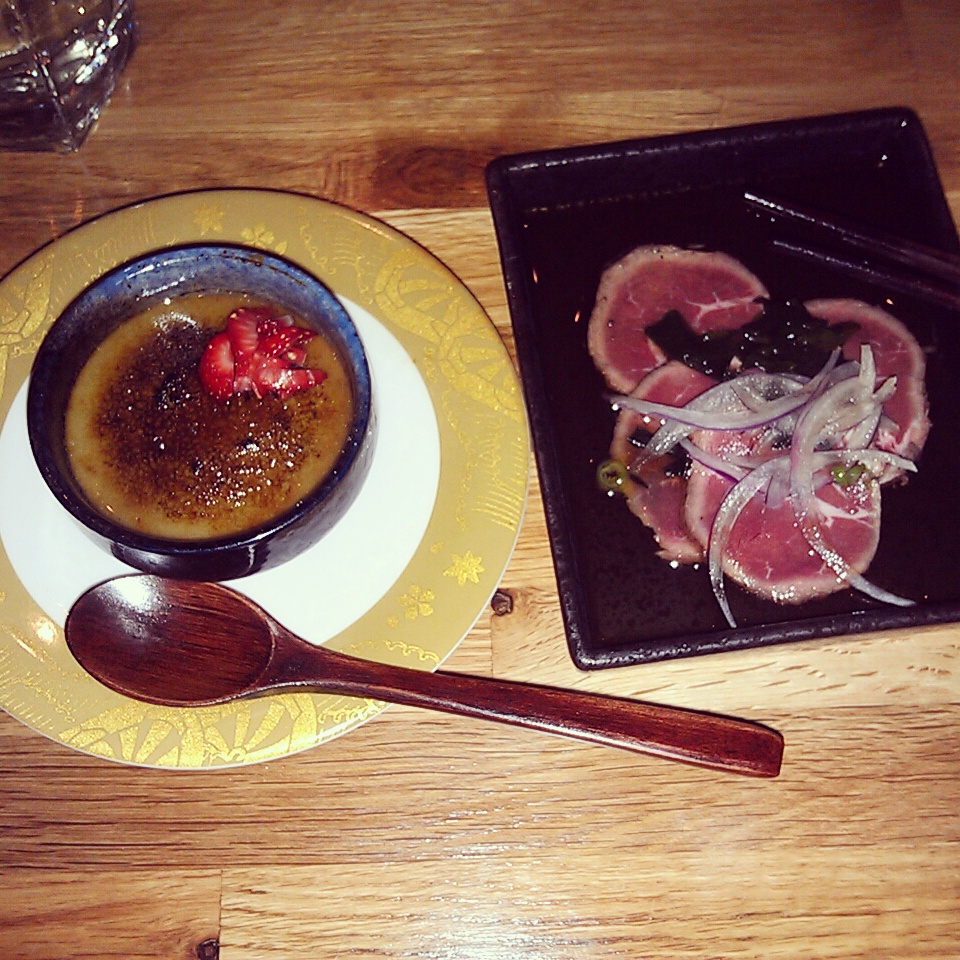IMG_20141109_211502 Published November 12, 2014 at 960 × 960 in Edmonton Restaurant Review: Japonais Bistro ← Previous Next → Matcha crème brûlée and beef tataki.