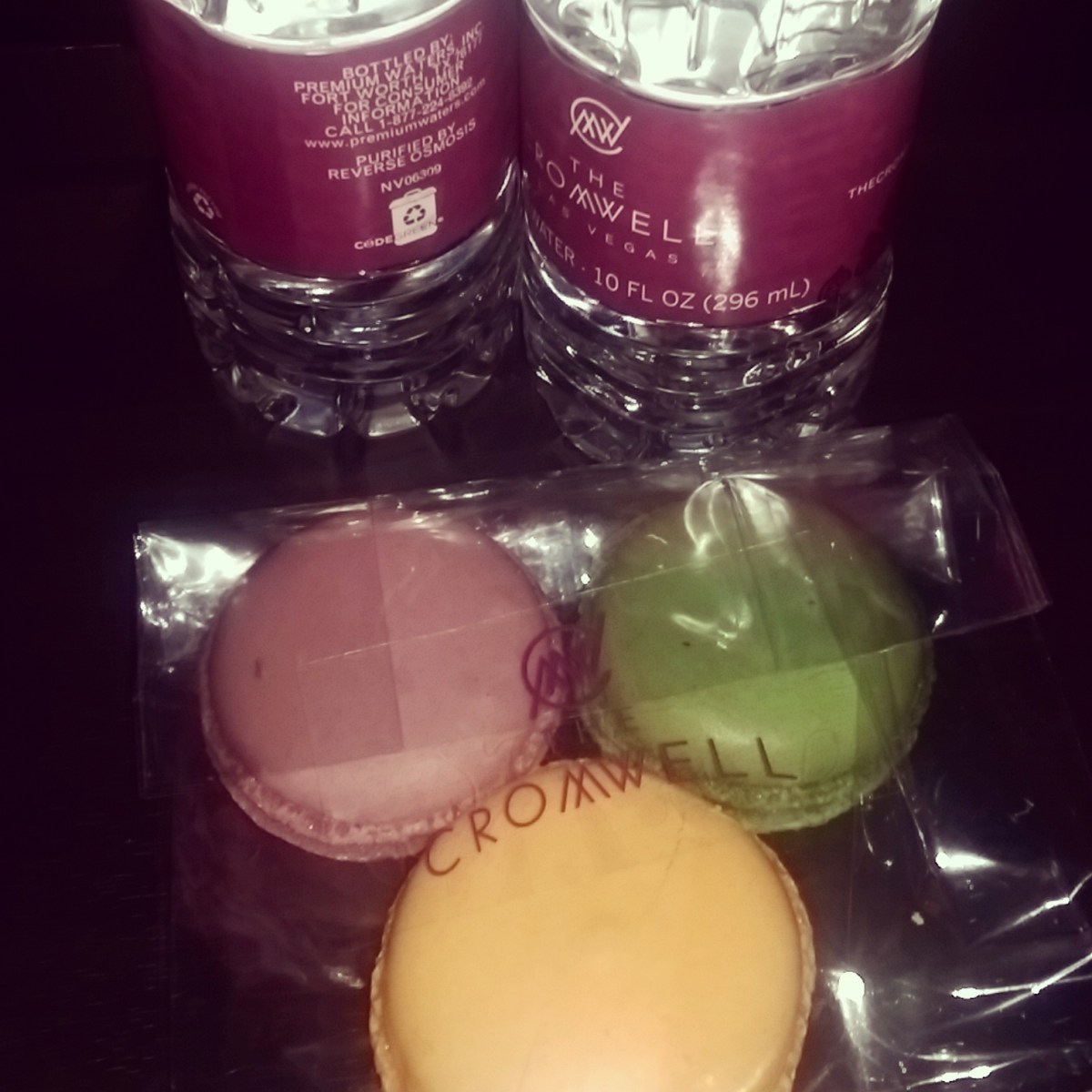 IMG_20141105_161255 Published November 16, 2014 at 1520 × 1520 in Vegas Revisited ← Previous Next → Bottled water and a bag of macarons left after the nightly turndown service at The Cromwell.