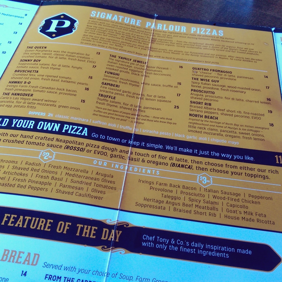 IMG_20141006_002008 Published November 20, 2014 at 1520 × 1520 in Edmonton Restaurant Review: The Parlour Italian Kitchen & Bar ← Previous Next → The Signature Pizza menu.