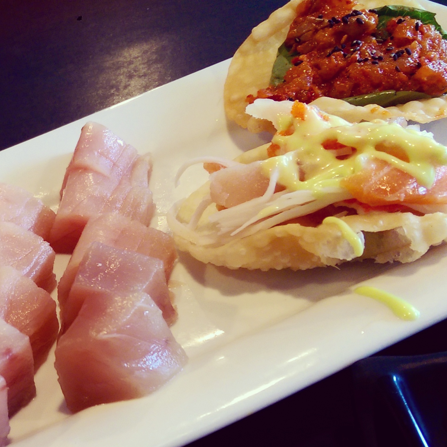 IMG_20141009_193302 Published November 27, 2014 at 1520 × 1520 in Edmonton AYCE Sushi Showdown: Zen Sushi & Grill vs. Watari Japanese Cuisine ← Previous Next → Spicy salmon and rainbow tacos with tuna sashimi at Watari.
