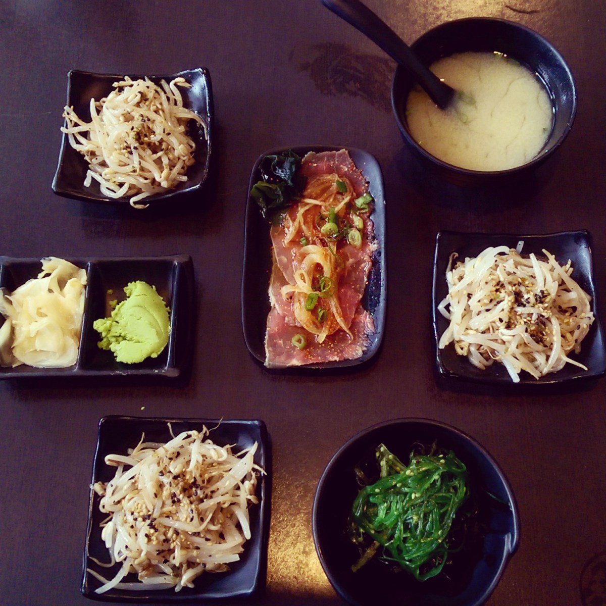 IMG_20141009_201126 Published November 27, 2014 at 1518 × 1518 in Edmonton AYCE Sushi Showdown: Zen Sushi & Grill vs. Watari Japanese Cuisine ← Previous Next → Miso soup, bean sprout and seaweed salads and beef tataki at Watari.