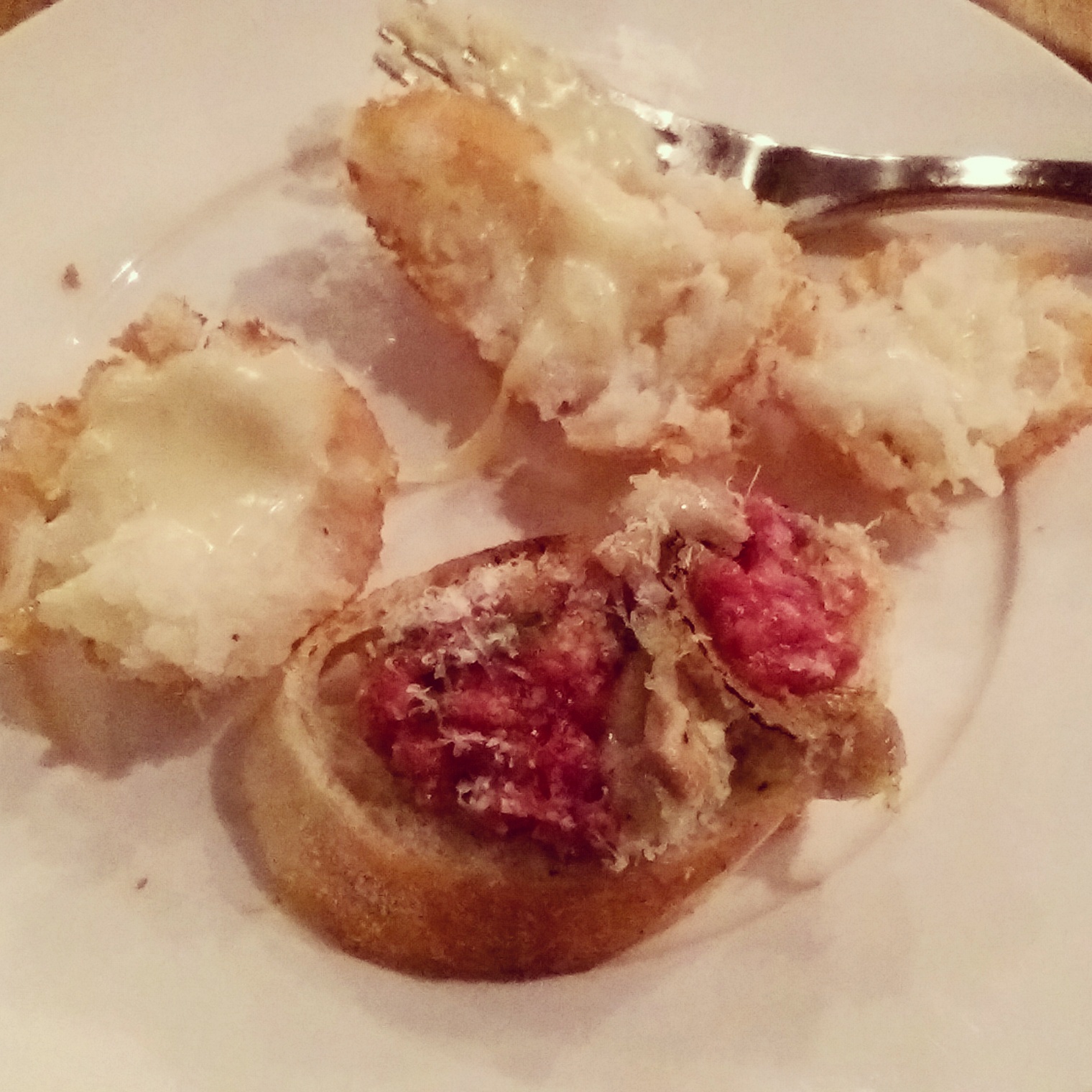IMG_20141115_110016 Published December 21, 2014 at 1520 × 1520 in Edmonton Restaurant Review: Cibo Bistro ← Previous Next → A broken arancini filled with Fontina cheese and roasted cauliflower, and a slice of crostini topped with salumi and shaved truffle.