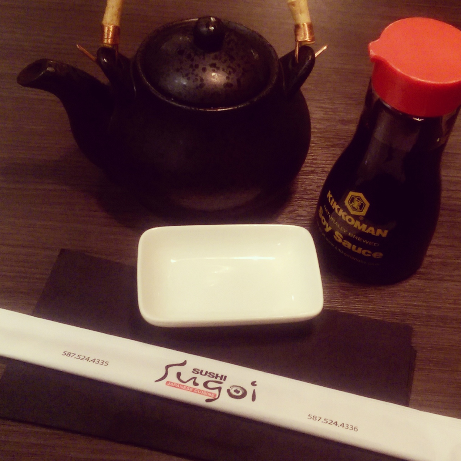 IMG_20150329_140533 Published March 29, 2015 at 1520 × 1520 in Edmonton Restaurant Review: Sushi Sugoi (Closed) ← Previous Next → Necessities of the Japanese meal…chopsticks, soy sauce, a sauce dish and tea.