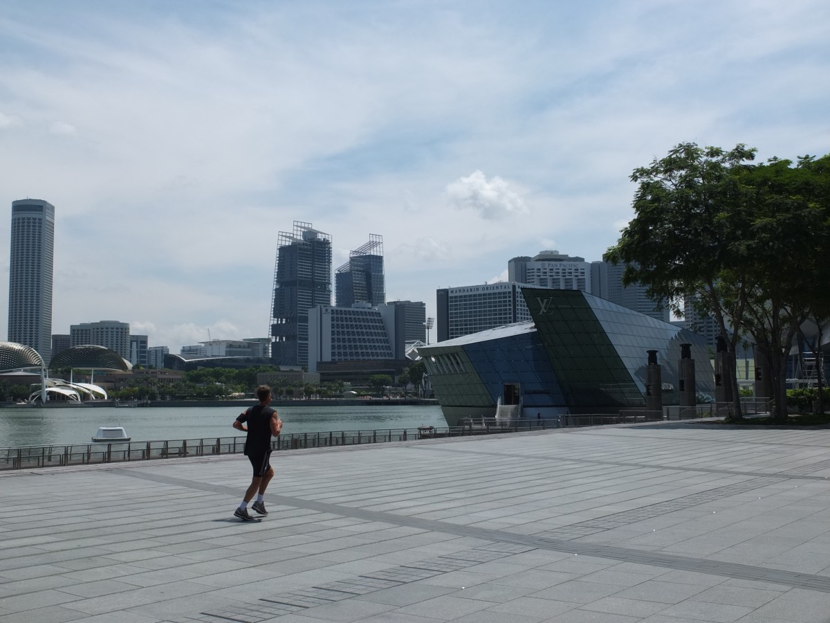 DSCF1519 Published June 22, 2015 at 2816 × 2112 in Asian Adventures Photostream: Hong Kong & Singapore ← Previous Next → A jogger runs along the promenade outside the Shoppes at Marina Bay Sands – crazy man!