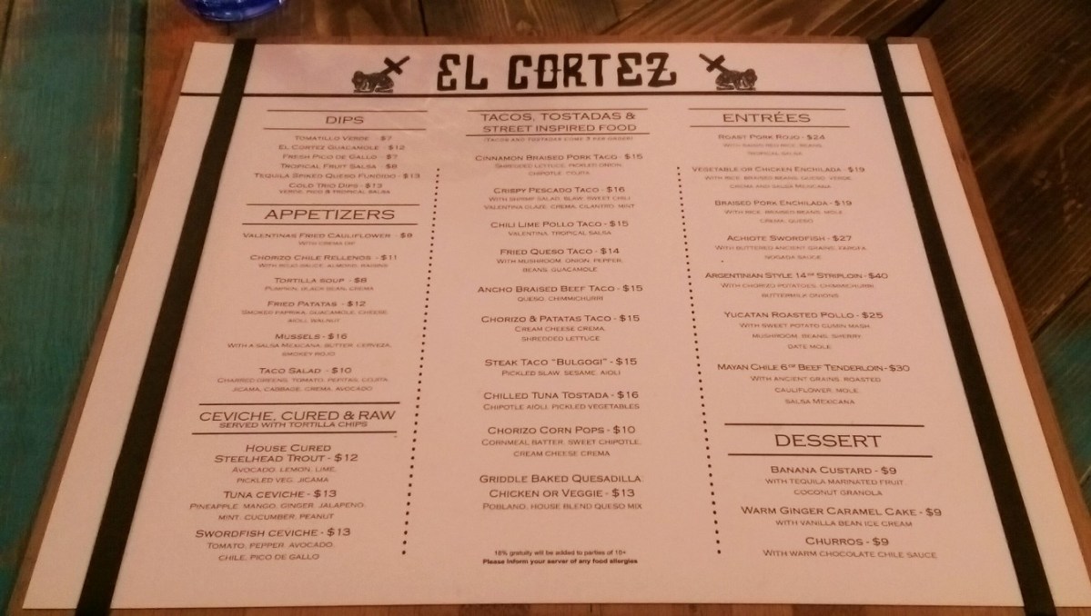 IMAG8274 – Copy Published November 13, 2015 at 1344 × 760 in Edmonton Restaurant Review: El Cortez Mexican Kitchen + Tequila Bar ← Previous Next → The food menu.