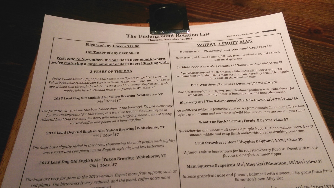 IMAG9899 Published January 6, 2016 at 1344 × 760 in Edmonton Restaurant Review: Underground Tap & Grill Next → The beer list is extensive and informative.