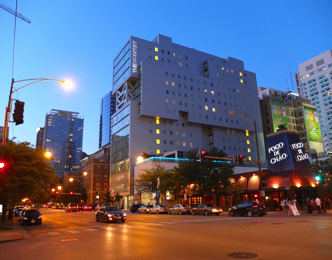 IMG_20160701_175211 Published July 2, 2016 at 1149 × 900 in Chasing the Chicago Skyline: Trip Recap & Gallery ← Previous Next → The exterior of The Godfrey Hotel at night.