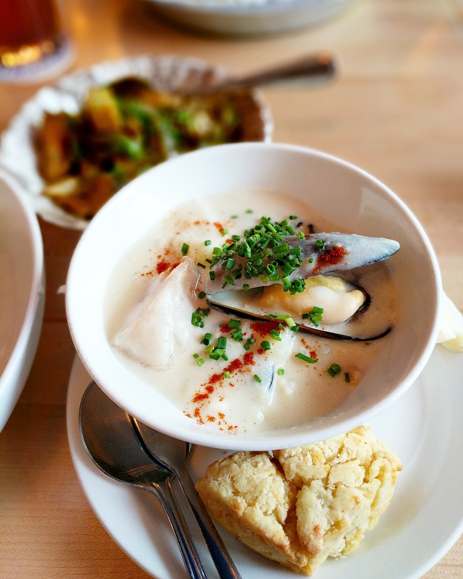 IMG_20170817_181117_906 Published September 5, 2017 at 914 × 1142 in Edmonton Restaurant Review: Grandin Fish ‘n’ Chips ← Previous Next → Half order of the Seafood Chowder & Cheddar Biscuit