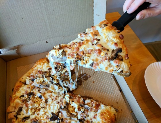 When we returned to the parlour, our order was nearly done. As the woman readied everything, we let her know of our appreciation by dropping off a tip. It was the least we could do considering she let us off on the GST earlier. Honestly, I think it put a skip in her step because she was extra nice to us the rest of the time we remained there. Once our pizza was finished baking, she asked if we were staying or going. Since we opted to eat in, she sliced up the pie, put it into a to go box (in case of leftovers), got us some paper plates, napkins, and a serving utensil, so we could dig right in.