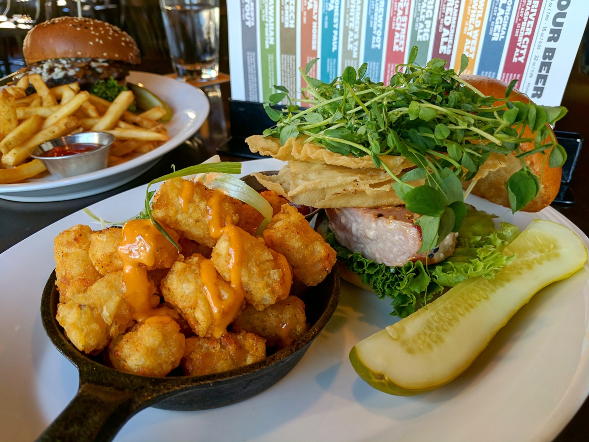 IMG_20170928_214231_598 Published October 8, 2017 at 1214 × 911 in Edmonton Restaurant Review: Brewsters ← Previous Next → Tuna Burger with Tater Tots and the Blue Bison Burger in the background.
