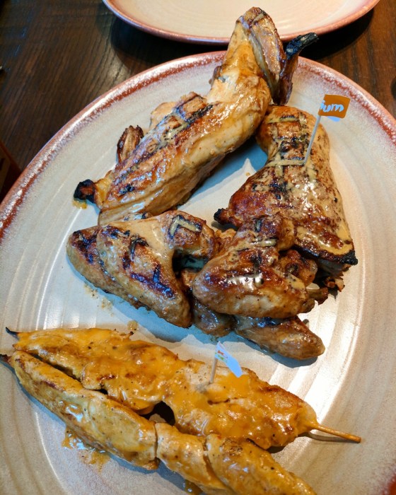 Our food didn’t take too long to arrive. The pair of us opted to share a Variety Platter ($32.95) intended for two to three people. It included a half chicken, five whole wings, two skewers, and two regular sides. On their menu is a scale called the PERi-ometer. It’s to be used to decide on the amount of heat appropriate for one’s taste buds. There were several choices, starting on the low end with Plain…ish to the high end of Xtra Hot. Although we’re quite comfortable with spice, I still wasn’t sure what to expect of Nando’s, so we opted for Medium on the half chicken and the wings. For the skewers, we chose Mango & Lime.