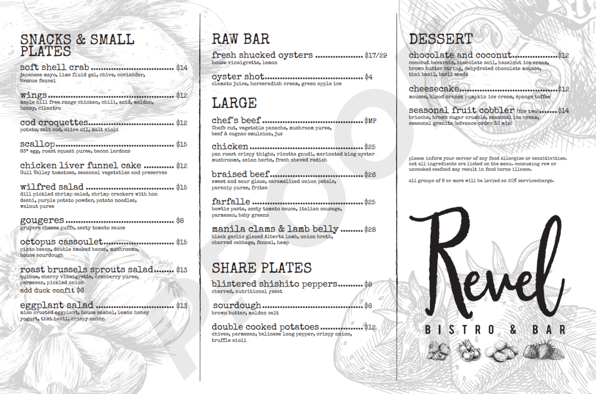 Revel Menu Jan 2018 Published January 20, 2018 at 1414 × 935 in Edmonton Restaurant Review: Revel Bistro & Bar ← Previous The current menu was introduced in January.