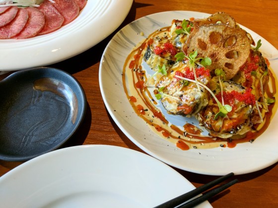 The eatery features a few hot stone meat options, too. I remember going to a Japanese grill in Kyoto where my friends and I tried this fantastically tender beef tongue. When I saw the Premium Beef Tongue ($16) on the Let’s Grill Sushi menu, I thought it’d be great to give it a shot. In Japan, the beef tongue was served like a filet of meat. Here, they had thinly sliced the tongue like carpaccio. It allowed the meat to cook super fast on the hot stone slab. Unfortunately, it had a chewier consistency than I hoped for. Regardless, I loved the three dips (salt, ponzu, sesame-type sauce) provided alongside the tongue. Next time, I may go for their duck though.