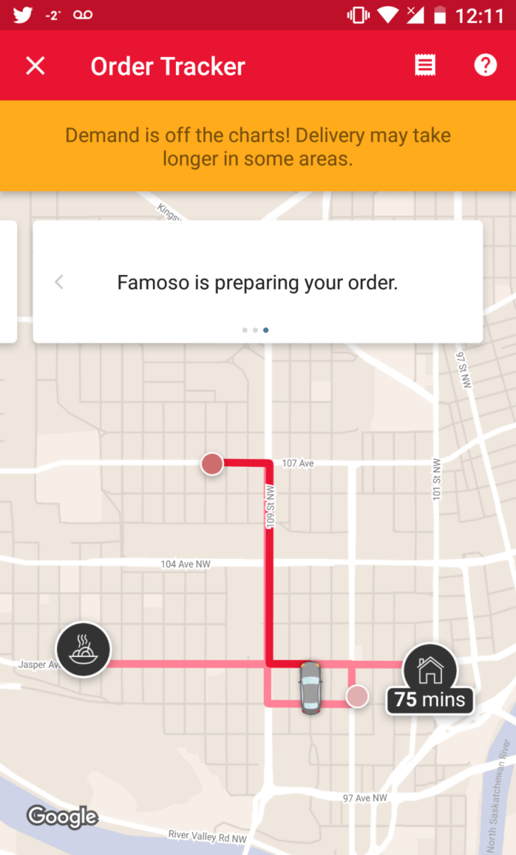 Screenshot_20180913-121138~2 Published September 30, 2018 at 907 × 1502 in Versus: Edmonton Food Delivery Services ← Previous Next → Really? Almost an hour into our wait and still another 75 minutes to go…at least?