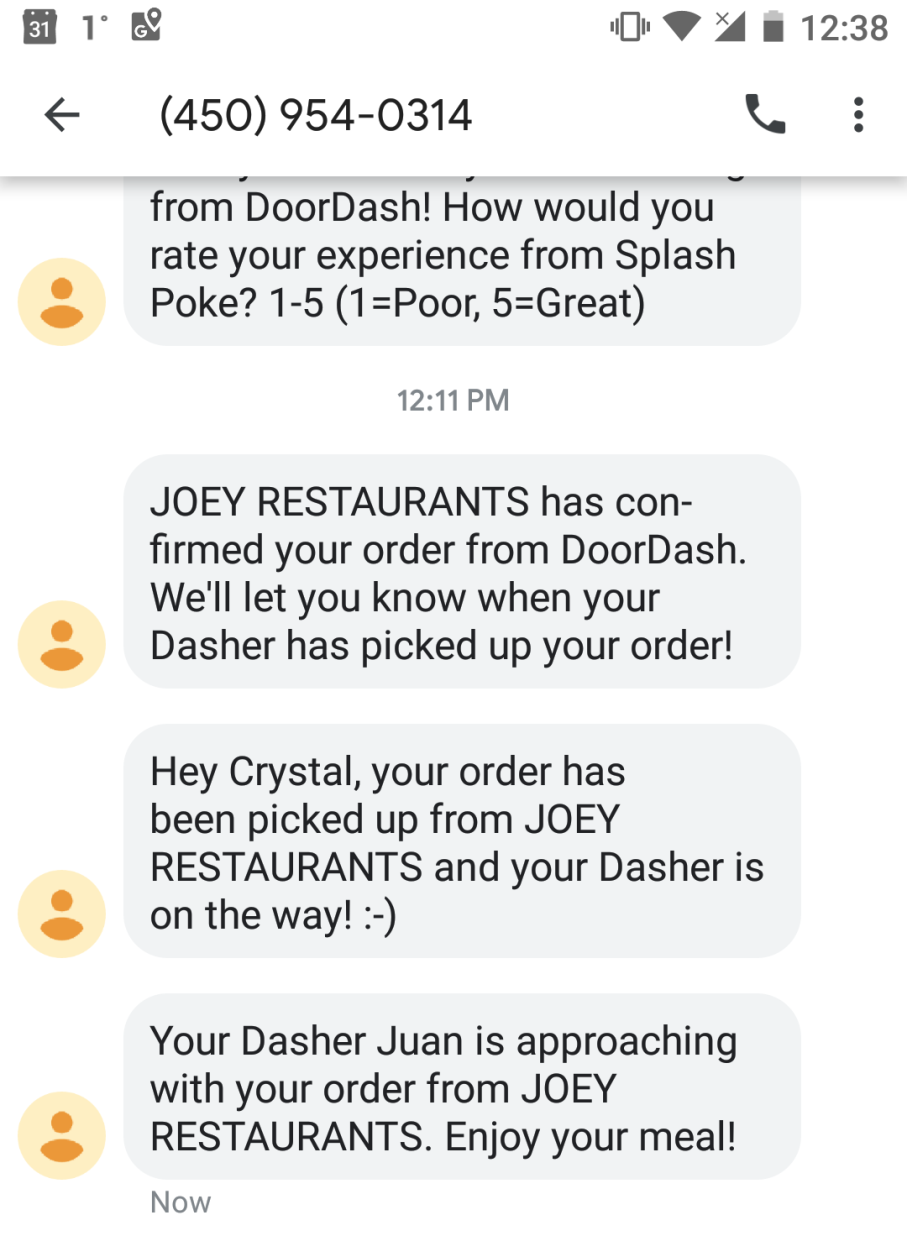 Screenshot_20180914-123850~2 Published September 30, 2018 at 907 × 1236 in Versus: Edmonton Food Delivery Services ← Previous Next → Text messages received from DoorDash kept me apprised of my order status.