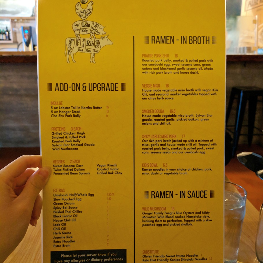 IMG_20180922_183445_301 Published September 23, 2018 at 911 × 911 in Edmonton Restaurant Review: Prairie Noodle Shop Next → Current ramen and extras on their menu.