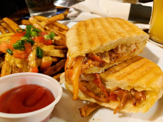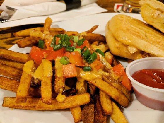 I selected the Smoked Chicken Panini ($10) as my main. It typically comes with fries or a tossed green salad. I chose to get the Beer Cheese Fries ($3) instead. The fries were blanched and then covered with the same beer cheese dip that came with the pretzels I’d eaten previously. They were then topped with diced tomatoes and green onions. Not bad, but the dip cooled off quickly and, again, they were scant with the cheese. Ultimately, I ate half of my fries with regular ketchup and a bit of the mustard that Kirk got on the side for his burger.