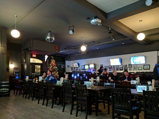 To be fair, there is a very quiet, tiny, cozy looking dining area, complete with fireplace, to the right of the door. However, it was already full, so we headed over to the lounge area instead. The setup is interesting with a few larger raised booths towards the back. In the center of the space were two rows of tables lined up parallel with a giant projector screen on the opposite side of the room. We tucked ourselves into a corner next to the big screen. Thinking back, considering the loudspeakers blaring the sound from that weekend’s NFL game, it may not have been the ideal spot to sit. Otherwise, it was cozy enough.