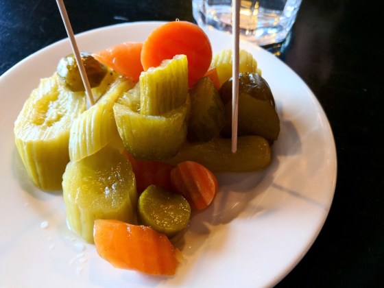The first thing we received was a plate of pickled vegetables. These were likely complimentary because I do not recall seeing them as an option on the menu. Kirk seemed to enjoy them as he ate the majority. I sampled what I think was a radish, which I didn’t mind. It was very acidic and had an interesting texture from soaking in the brine. Definitely not crispy. The carrot was harder and didn’t take in the brine as much, so it still held some of it’s density and tasted less pickled overall. I guess, for me, they were a little too wet. I like drier pickled veggies like the carrots, daikon and cucumber on a Vietnamese sub or the diced pickled turnips we found on other dishes here.