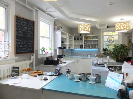 Located at 103 Street and 100 Avenue, it’s actually ridiculously close to my office. Yet, I’d never been there before. Reviews were high on Google, so I deemed it the perfect pick. The cafe itself is housed in the lower level of an older brick facade building, which may make you think that it’d be dark and secluded; however, that’s far from the case. They’ve got a lovely little gated outdoor patio, and inside, the wall of windows actually brings in plenty of natural light. It’s a fairly large space, too, with seating for about 30 people, including a cozy nook with a couch and a couple of armchairs.