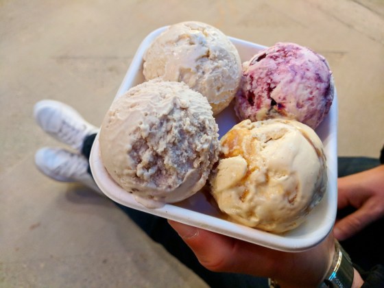 Kirk and I decided to share a flight without any added waffle cones. It took a while for us to pick four out of the dozen plus flavours (I think they usually have even more to choose from), but we eventually got it down to the Lemon Curd Blueberry, Tahini Cookie Dough (Vegan), Moonshine Brown Butter Pecan, and Bananas Foster & Rum Caramel.