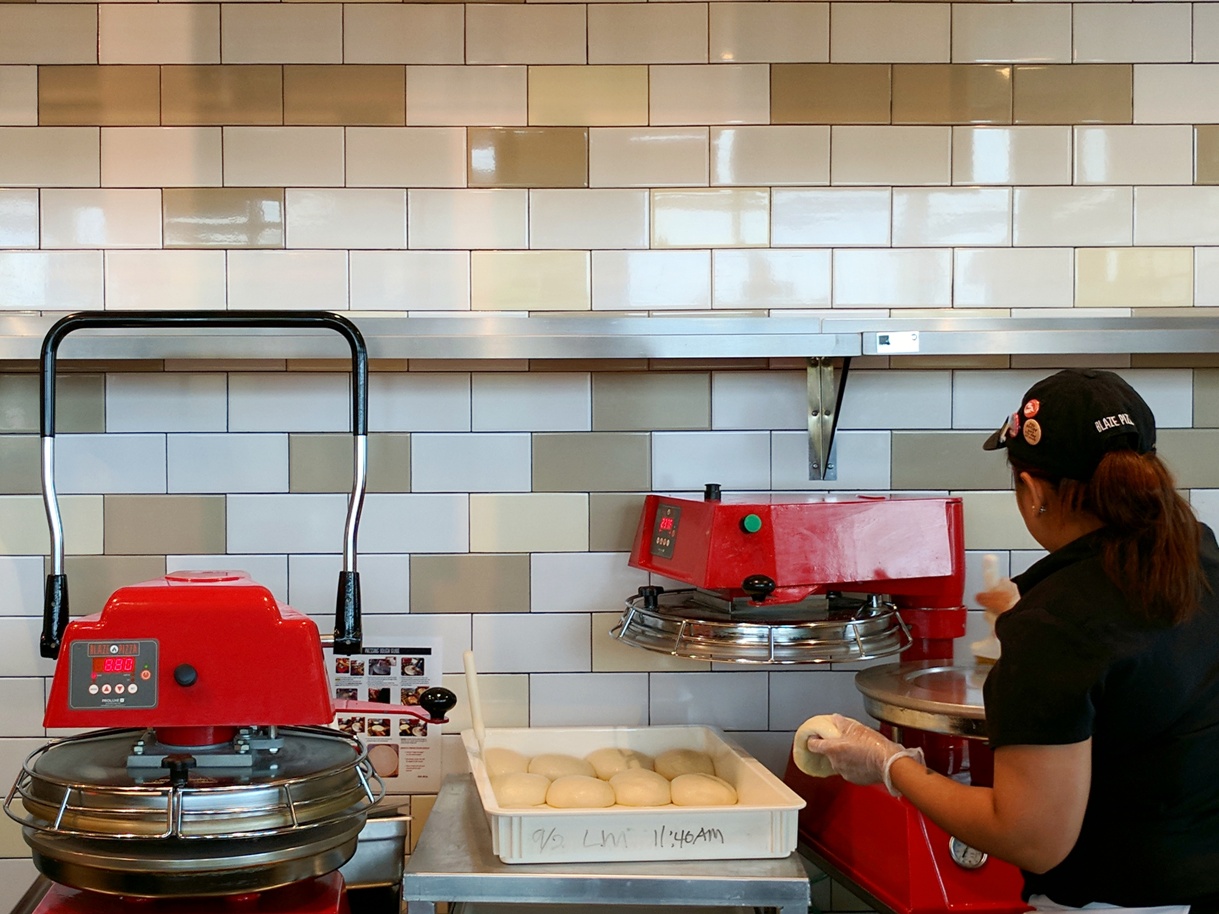 Pizza dough being flattened.