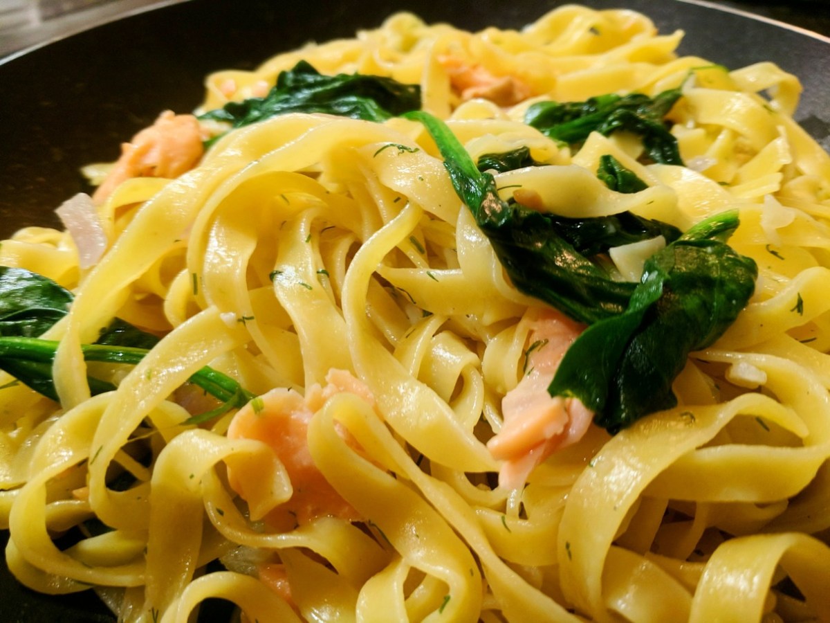 IMG_20180301_211517_650 Published March 5, 2018 at 1214 × 911 The One-Pot Pasta with Smoked Salmon and Spinach before the cream cheese was added.