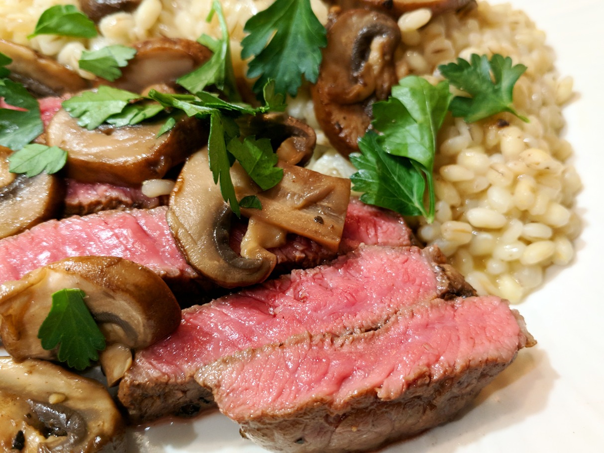 Perfectly seared medium rare steak.