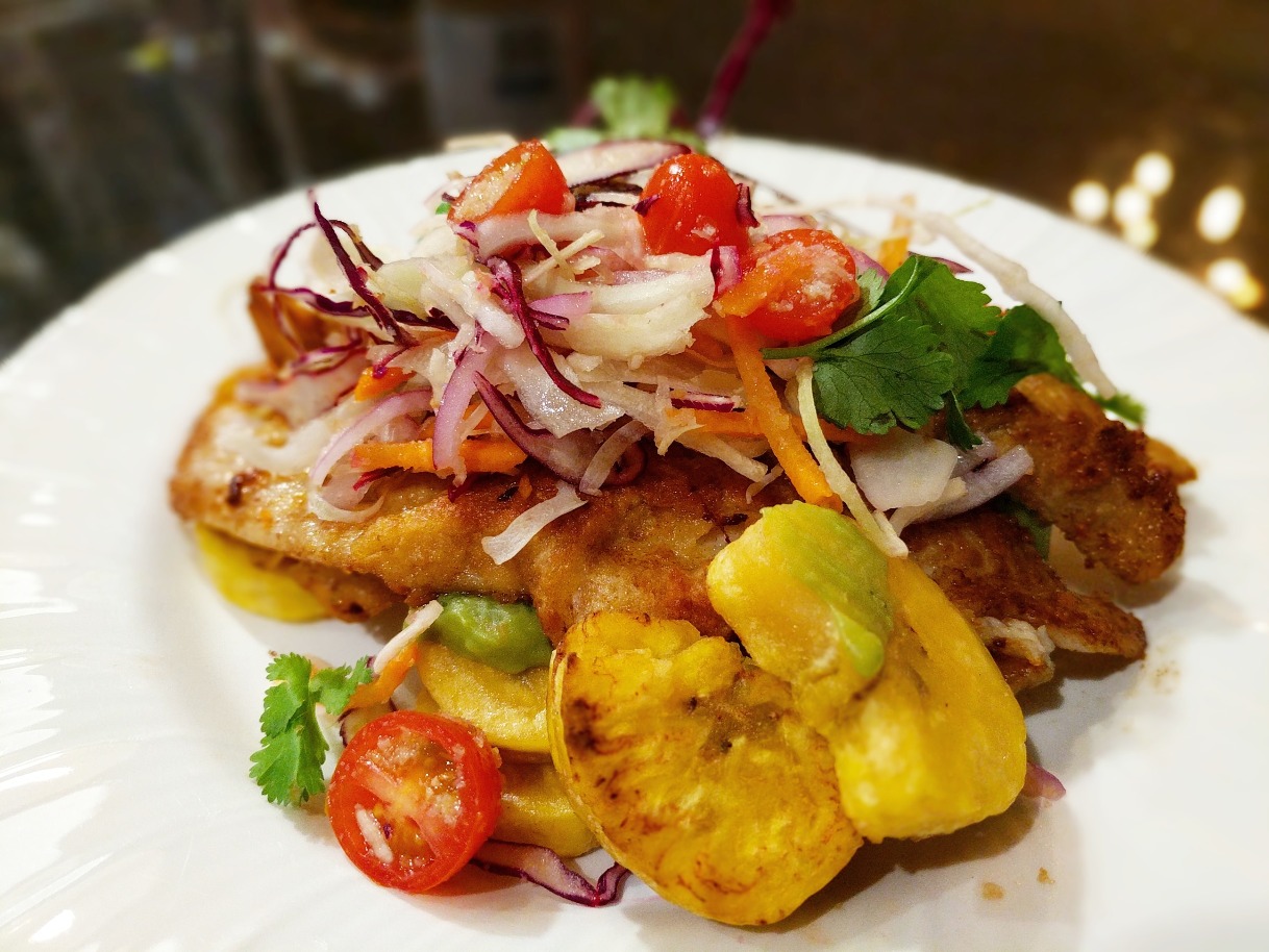 IMG_20180301_220932_647 Published March 5, 2018 at 1218 × 914 Crispy Battered Sole with Fried Plantains, Slaw and Guacamole