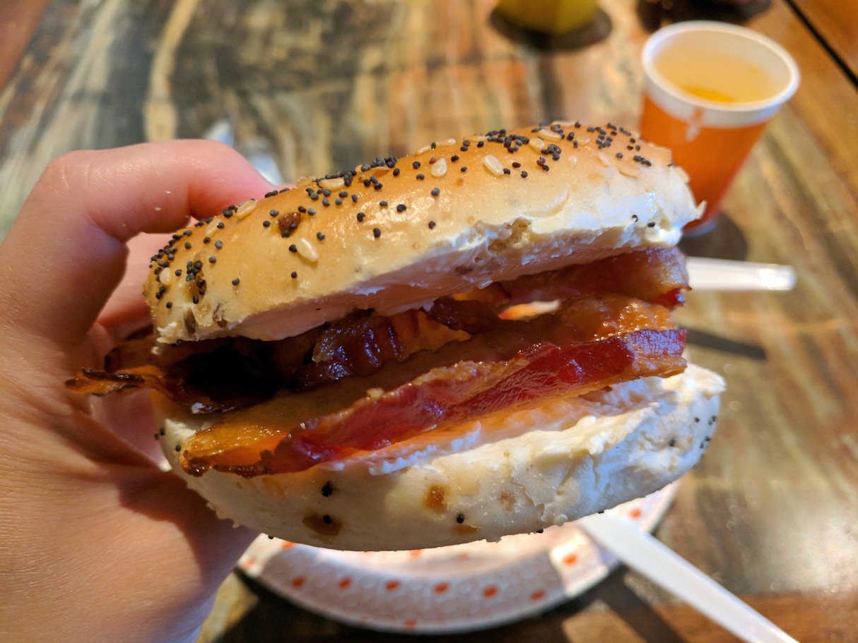 IMG_20180714_111516_468 Published July 14, 2018 at 1214 × 911 My breakfast at the Hampton Inn. Bacon on an everything bagel with cream cheese.