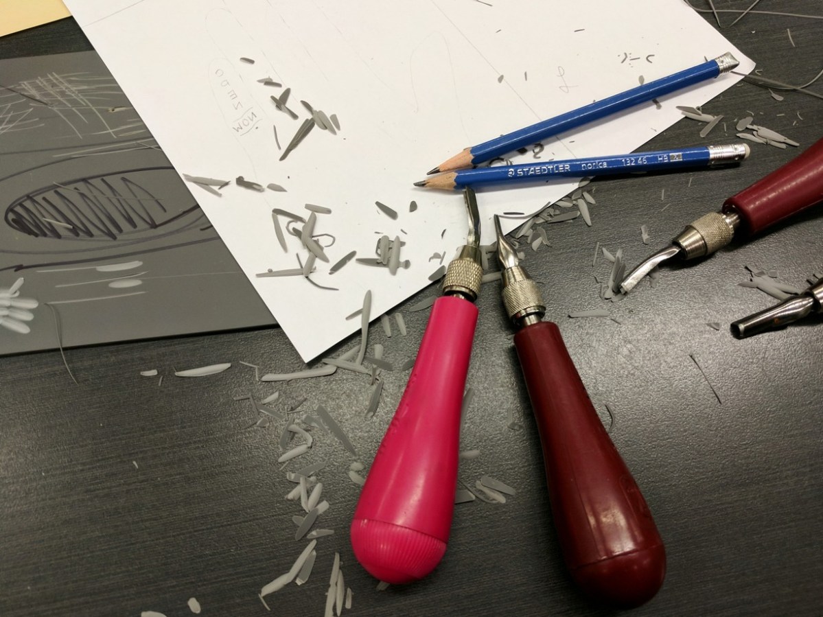 Carving our designs out of lino.