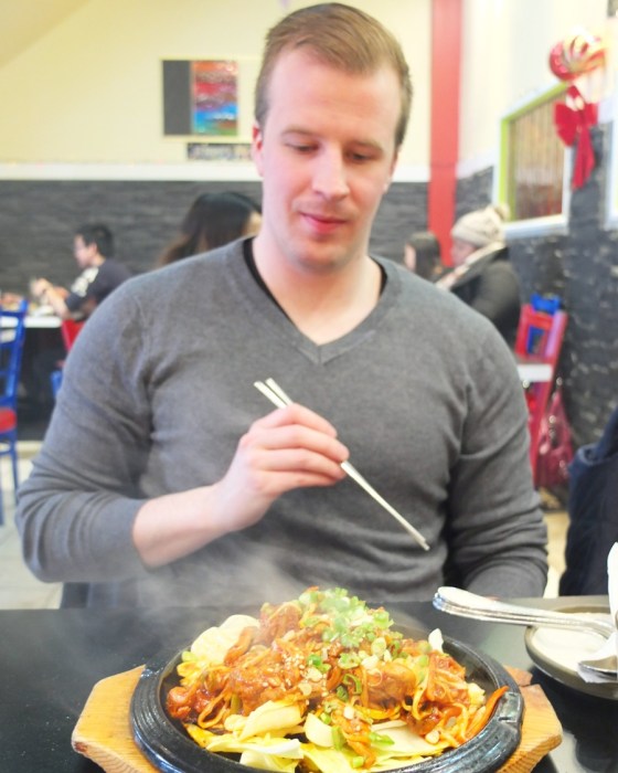 I voted for the Korean Shortrib dish and it did not disappoint. Sure, it could have used a little extra garnishing. Perhaps a side of veggies to go with it. Aside from that, the AAA Alberta boneless short ribs were top notch. Yes, the meat is sliced fairly thin, but there were three long slabs of beef placed on the hot skillet, likely amounting to about ten ounces of steak. The bottom piece was about half to three quarters of an inch thick and cooked to medium/medium rare. The meat was succulent with just a slight amount of fat, which helped to ramp up the flavour of the Korean Kalbi (or Galbi) marinade of Asian pear, soy, honey garlic and sesame. I ate up every last bite of the short ribs and the rice. In the end, I even added in the leftover radish and slaw from the pork belly dish for good measure.