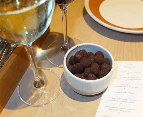 We began our journey through ALTA’s offerings by nibbling our way through a small bowl of the Malted Hazelnuts. The chef, showing his youth, described them as an adult version of cocoa puffs, which isn’t far off. After what sounds like an arduous and time consuming process of hand peeling the hazelnuts, they are then malted to amplify the taste. These little balls, upon hitting the tongue, have a grittiness on the outside and give off a coffee-like flavour that subsides to a slight saltiness as opposed to an anticipated nutty essence. Like the act of smelling coffee beans between tasters of wine, these seemed to be a great snack to have periodically as a way to refresh the palate.