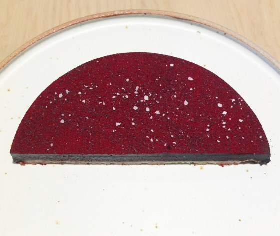 No dinner is complete without dessert. With only a couple of options on the menu, we chose to go with the Tart of Black Malt. It hadn’t occurred to us that the malt was actually the malted hazelnuts eaten throughout the evening just pulverized and blended with beeswax and butter to give it the consistency of a chocolate ganache. The mixture was set over a crust made of crushed pumpkin seed. If we’re going by size, this half moon tart is excellent for sharing as there’s plenty to go around. Still, by far the greatest part of this dessert had to be the coating of finely granulated freeze dried black current on the top (sparsely accented with flakes of salt), which not only gave it a rich magenta colour, but also a sweet tartness that played well with the deep and aromatic flavour of the malt.