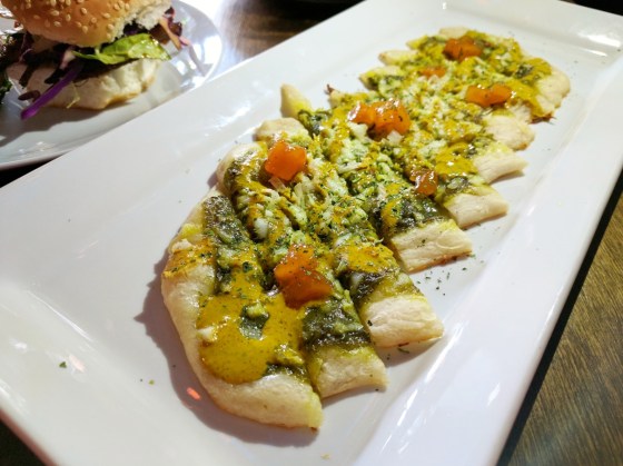 Available from 3pm to 6pm every day and 9pm to close from Sunday to Thursday, I love taking advantage of happy hour deals. It can be an ideal way to have date night while getting to sample several things and save money. On this particular occasion, Kirk stuck to the Amber/Red SM Draught ($4). It tasted fine to me; fairly smooth and not overly hoppy. My preference is for cocktails, so I chose to go with the Saturday special of White Sangria ($7). Made with Absolut vodka, lemon juice, stone fruit syrup, white cranberry juice, Sauvignon blanc, raspberries, peaches and topped with State slush, it certainly made for easy drinking. Nothing too out there, and it was neither bitter or overly sweet. I could actually have done without the State slush though. It’s like a poor man’s version of a Slurpee with ice that is harshly crushed and quickly clumps up into a solid ball.