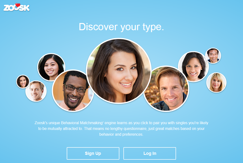 A screenshot of one of the main pages before logging into or signing up for Zoosk.