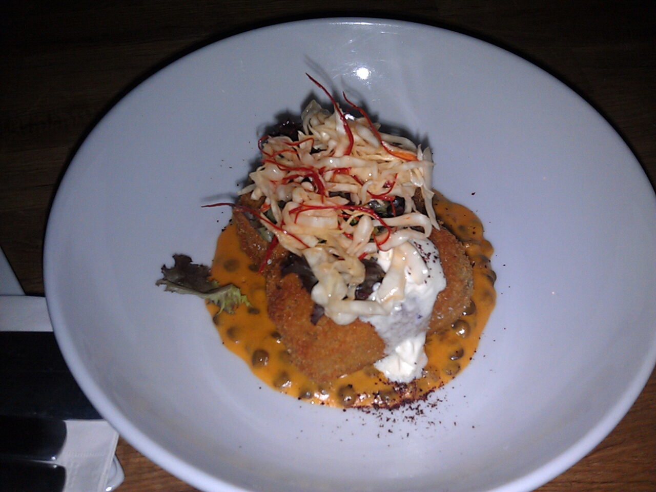 For our salad, we received roasted beets, caramelized onions, Stilton blue cheese and spicy greens. I can’t say that I tasted any heat from the greens laid atop the salad. That is unless cilantro is counted as spice. Personally, the herb sort of separated me from dish as I’m not a fan of the taste. To most, it’s refreshing. To me, it’s unpleasant. If I have to, I can get through a cilantro dish though. In this case, it wasn’t terrible. More than anything, the pungency of the blue cheese and the sweetness of the onions and tender roasted beets helped to mask any unwanted enhancements. My friend, conversely, loves cilantro and this plate turned out to be her favourite of the night.