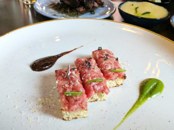 Plates that we were presented with at the preview event included: Tostada, Pate, Sweetbreads & Tendons, Wagyu Tartare, Marrow Mash, Pickled Asparagus, Liver & Onions, Tongue, Brisket, Miyazaki Chuck Wagyu, Hickory Smoked Chocolate, and Pineapple Cake. Almost every one still resides on the current soft opening menu in some form or another. As they continue to receive feedback they are tweaking the dishes to find the best fit. Eventually, the tongue to tail menu will be expanded to fully encompass the whole animal as available options, at the moment, are limited to slightly more common offals.